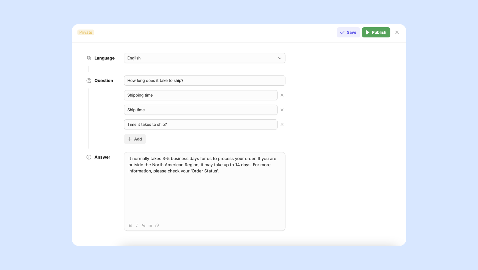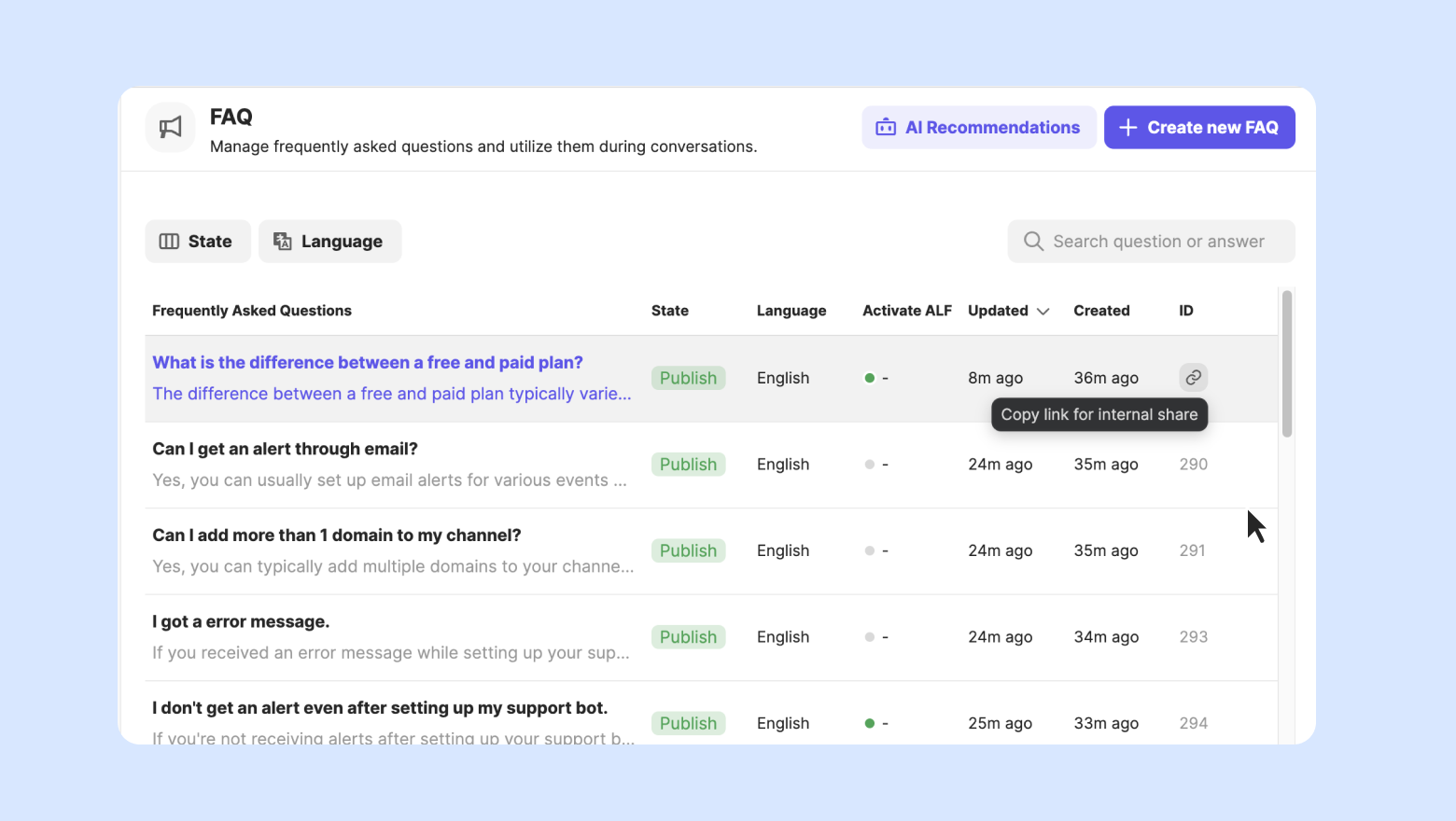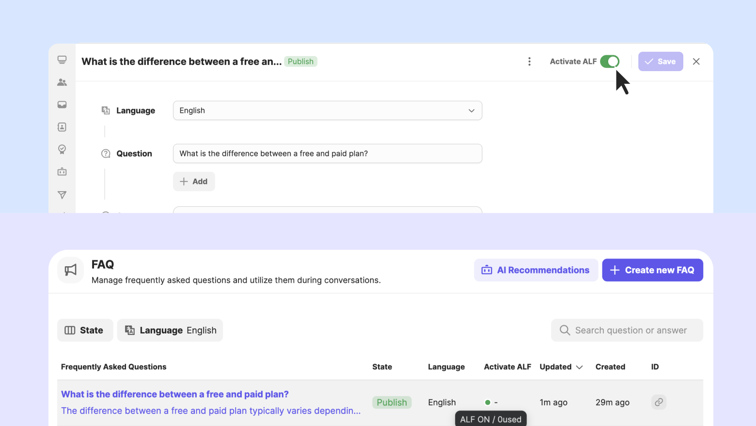 If your FAQ is public, you have the option to specify whether or not you want AI agents (ALF) to utilize it. (→ Refer to the ALF guide)