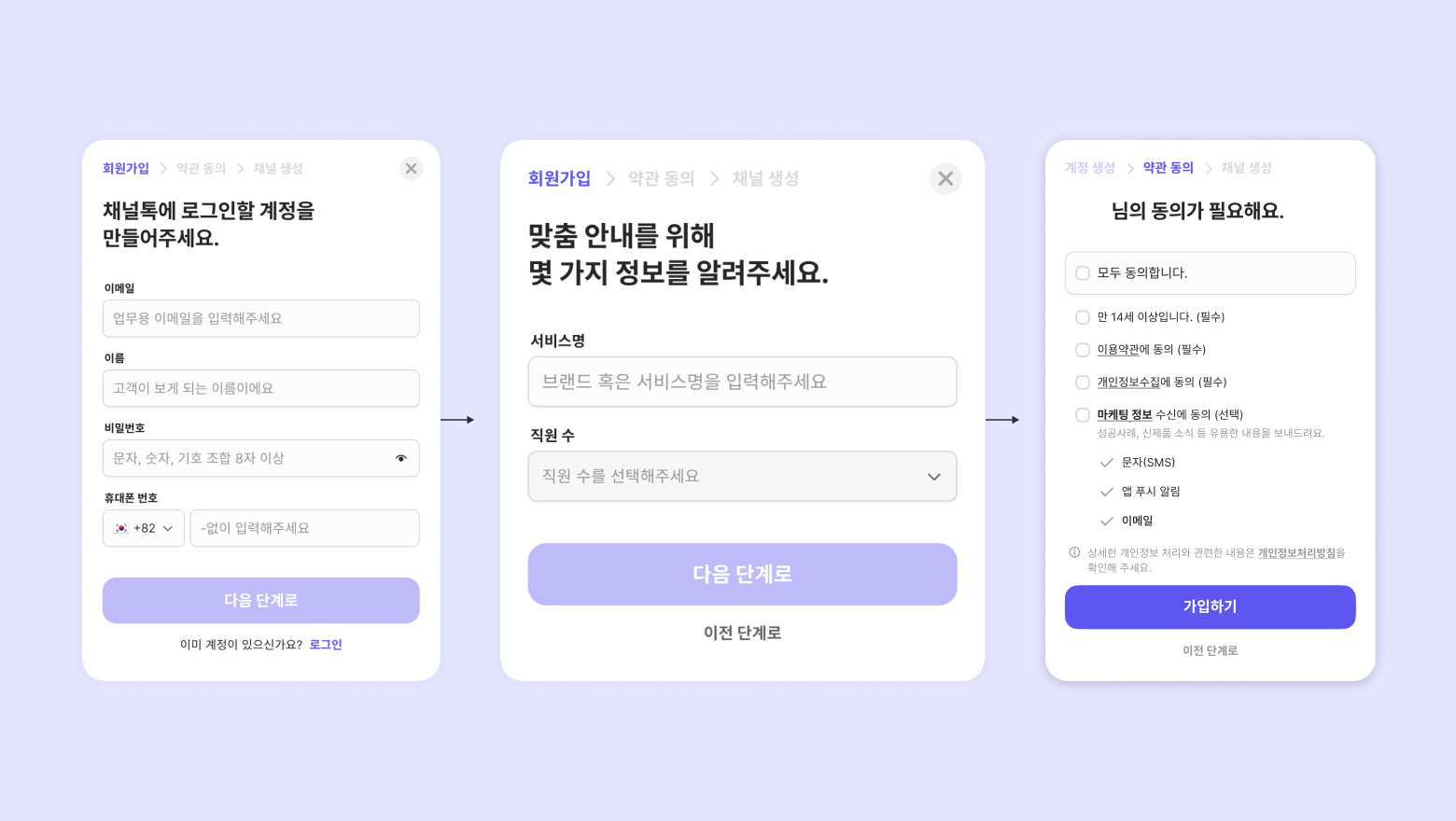 You don't need a single, central company account to start using Channel Talk. Since we support individual accounts, every team member can easily use Channel Talk with their own personal login.