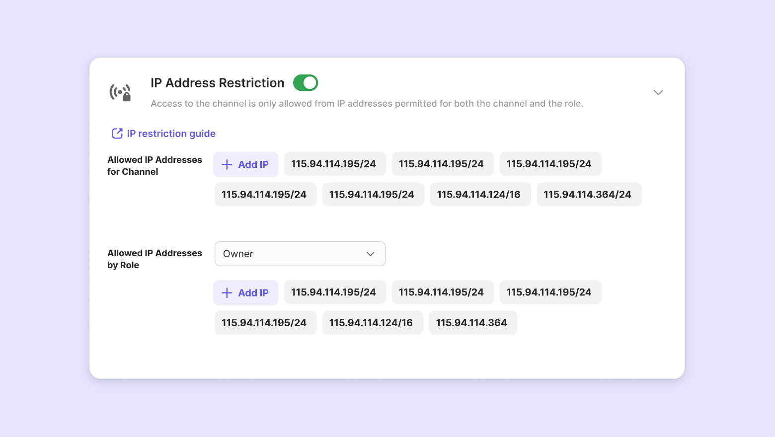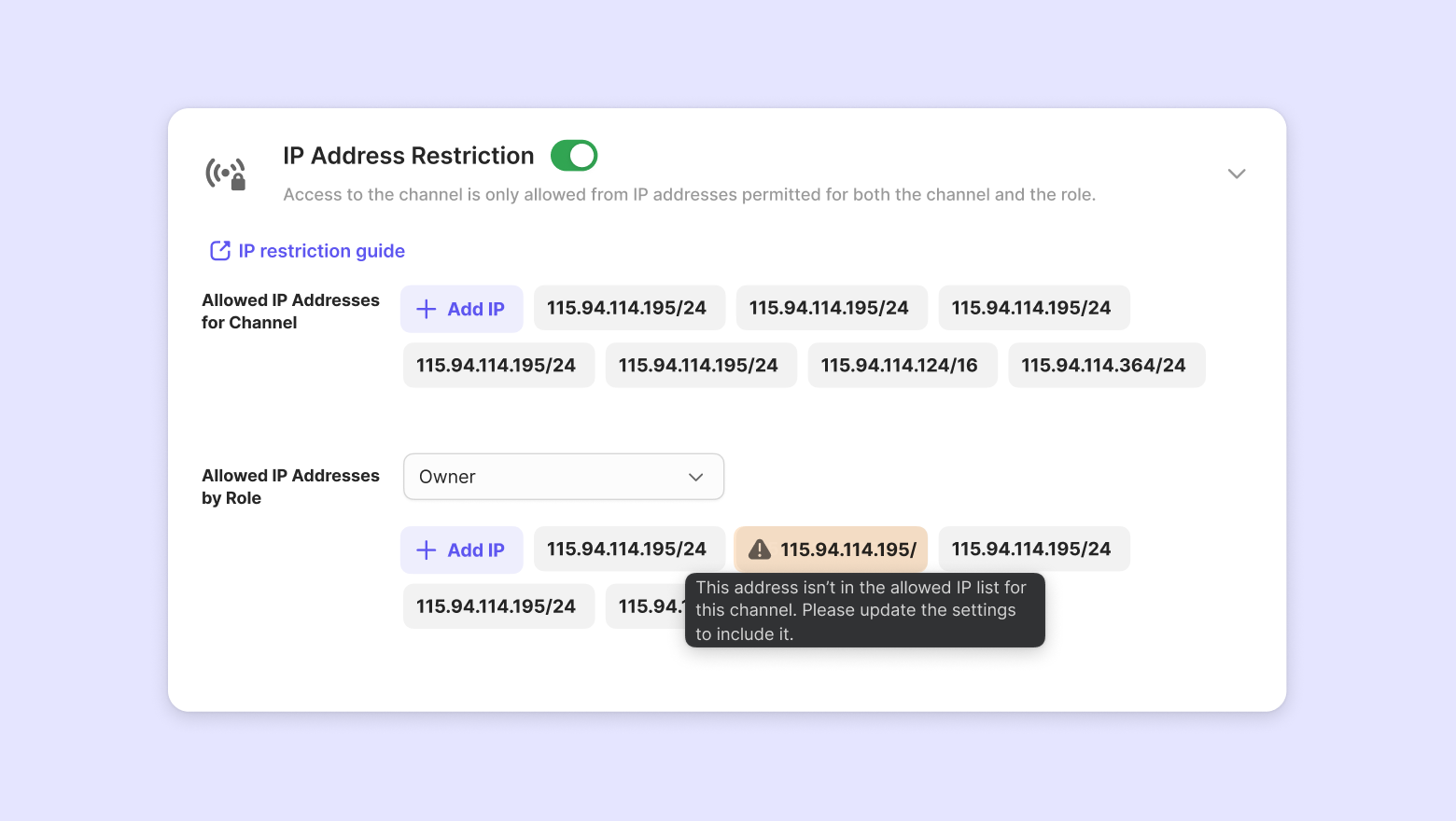 ⚠ You will see a warning icon if a role-based permitted IP is not included in the channel-level permitted IP list.To fix this, please make sure that each role-based IP falls within the range of the channel-level IPs.