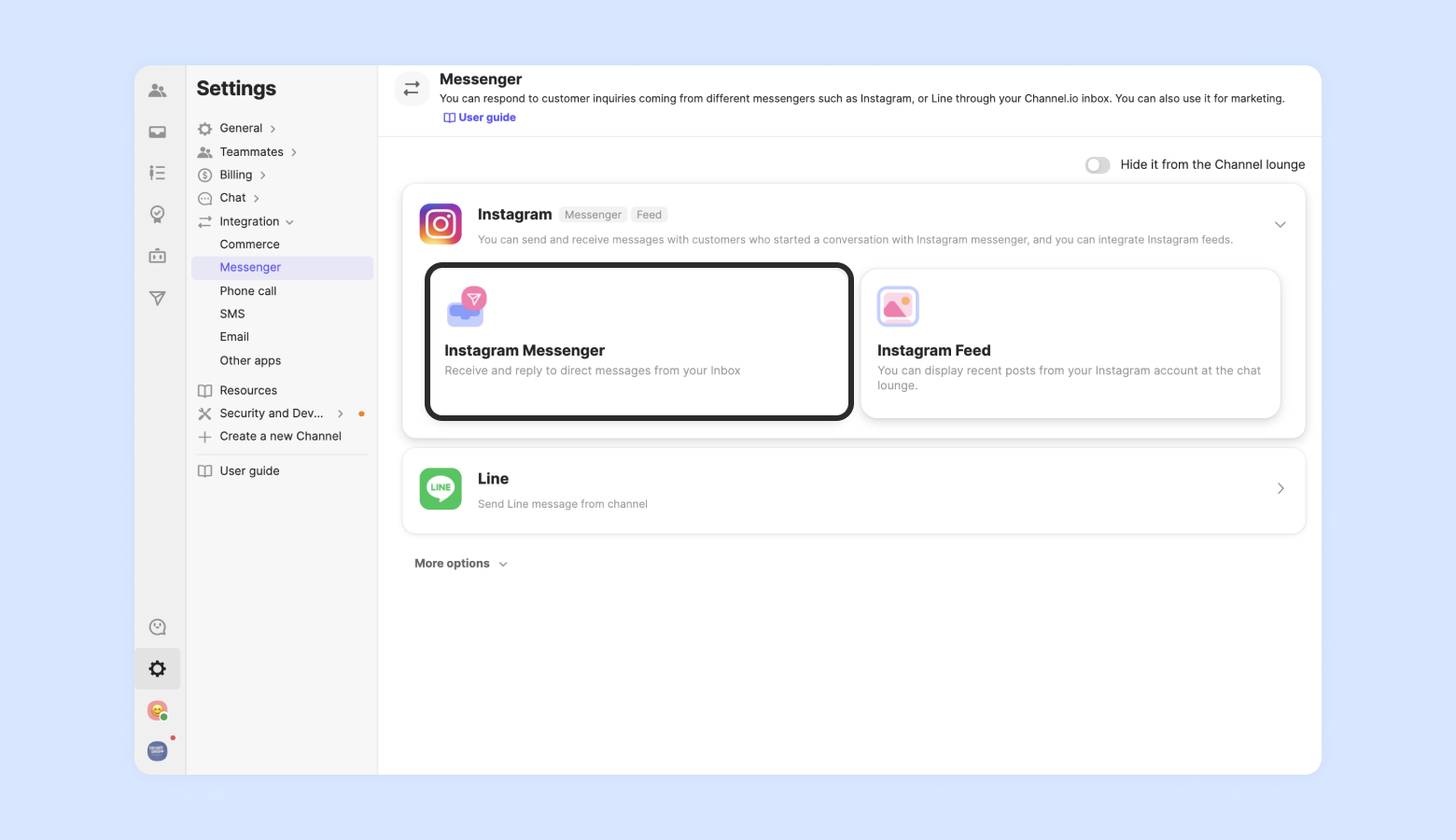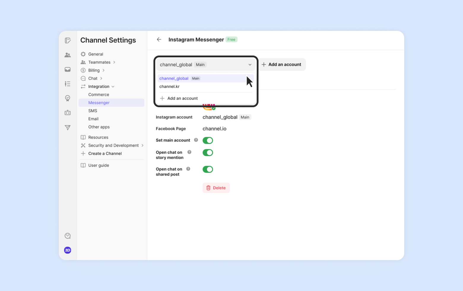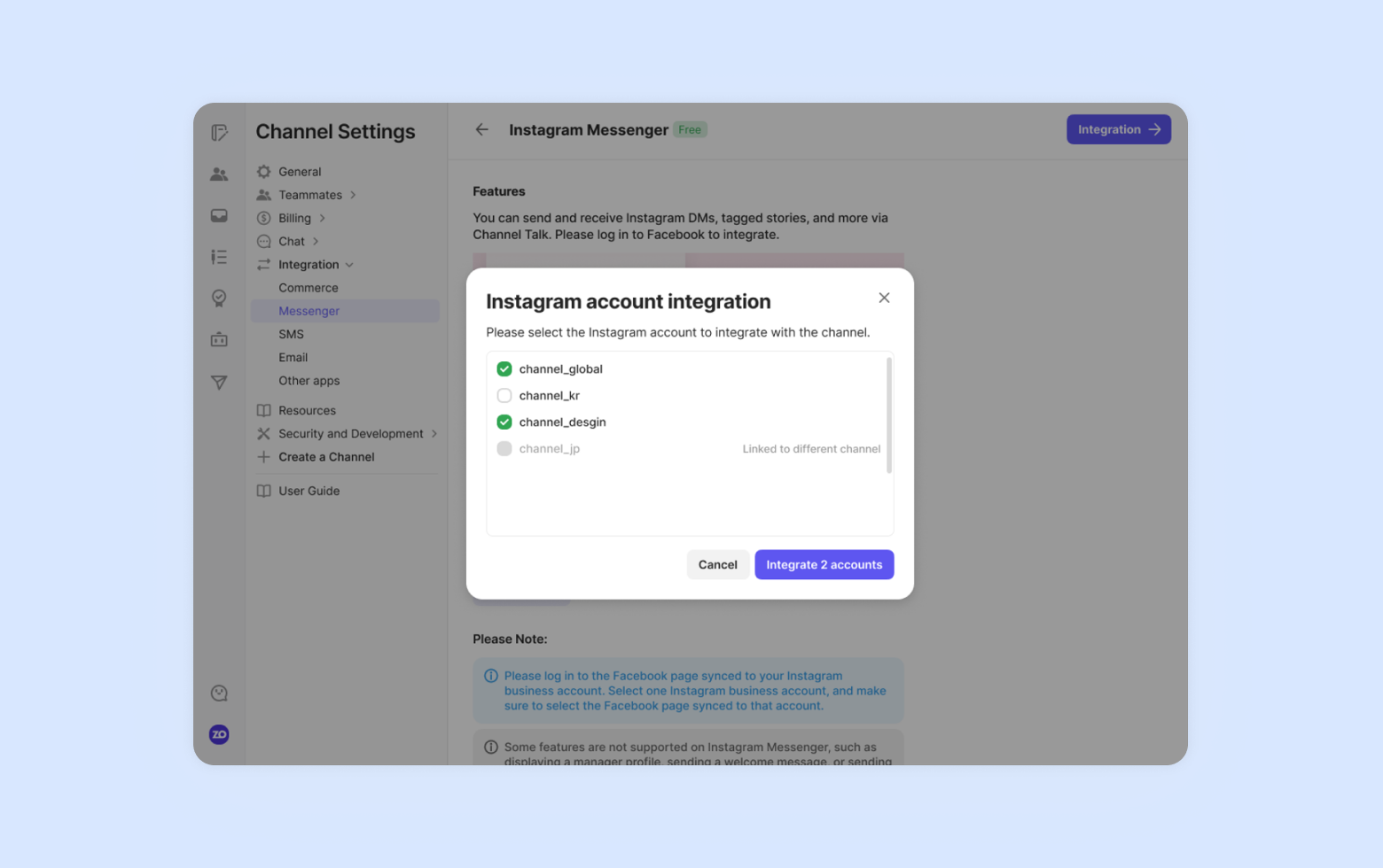 You can connect multiple Instagram Messenger accounts to a single Channel Talk channel. If you want to add a multi-channel integration to an already integrated Instagram Messenger, follow the steps below.