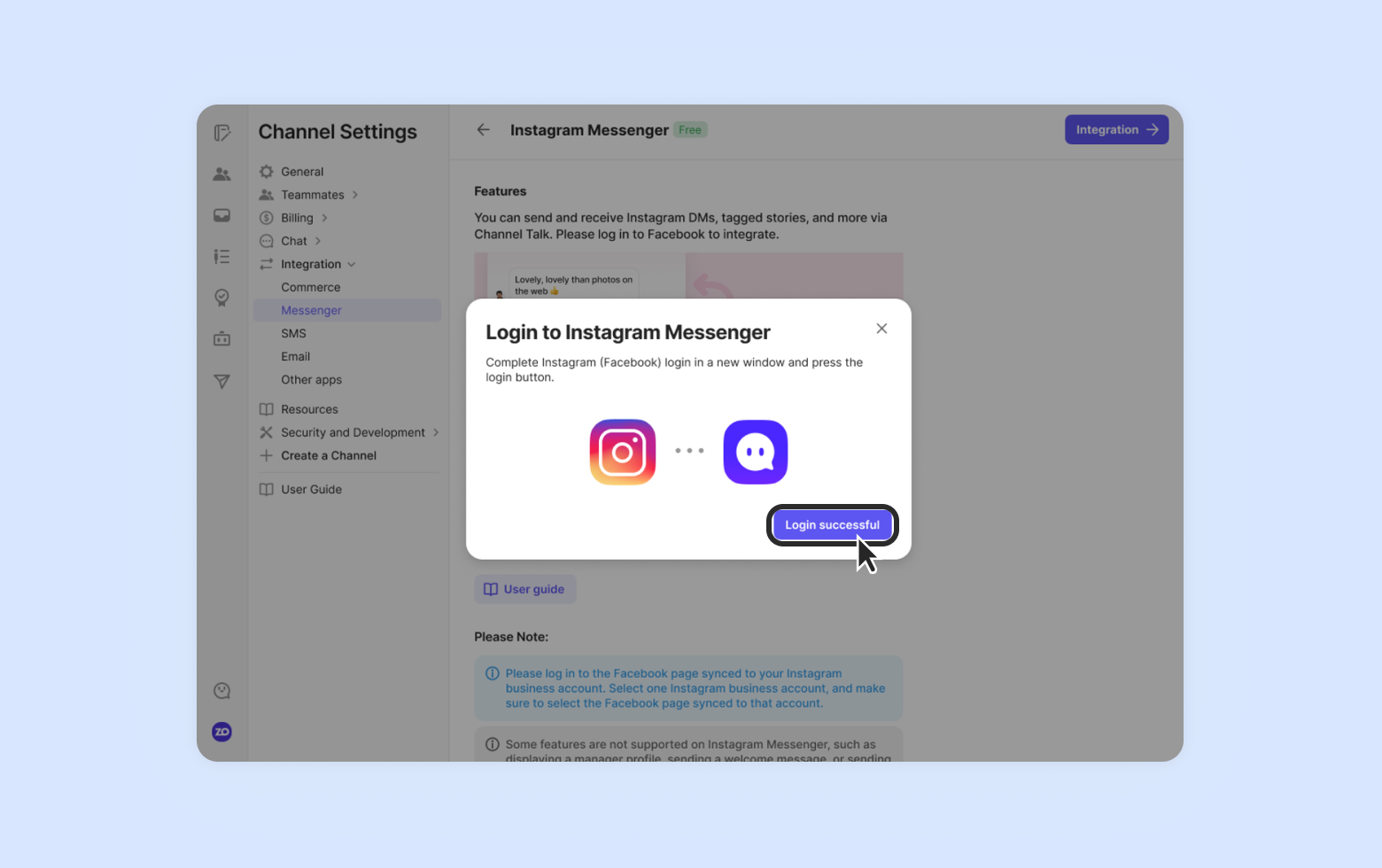 When the login process has been completed on the Facebook side, click 'Login successful' on the Channel Talk screen.