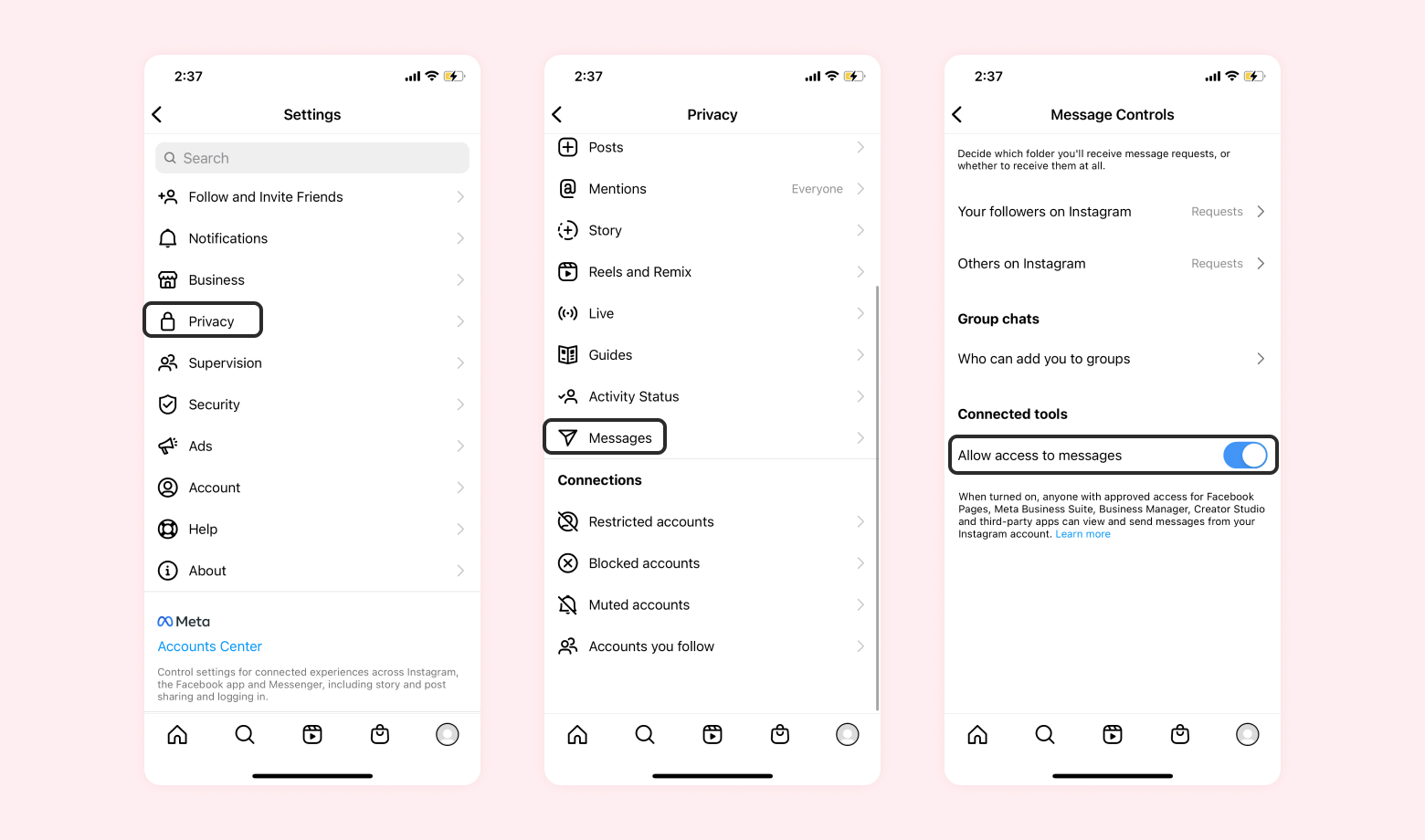 Go to [Settings] - [Privacy] - [Messages]. Turn on ‘Requests’ for [Your followers on Instagram] and [Others on Instagram].