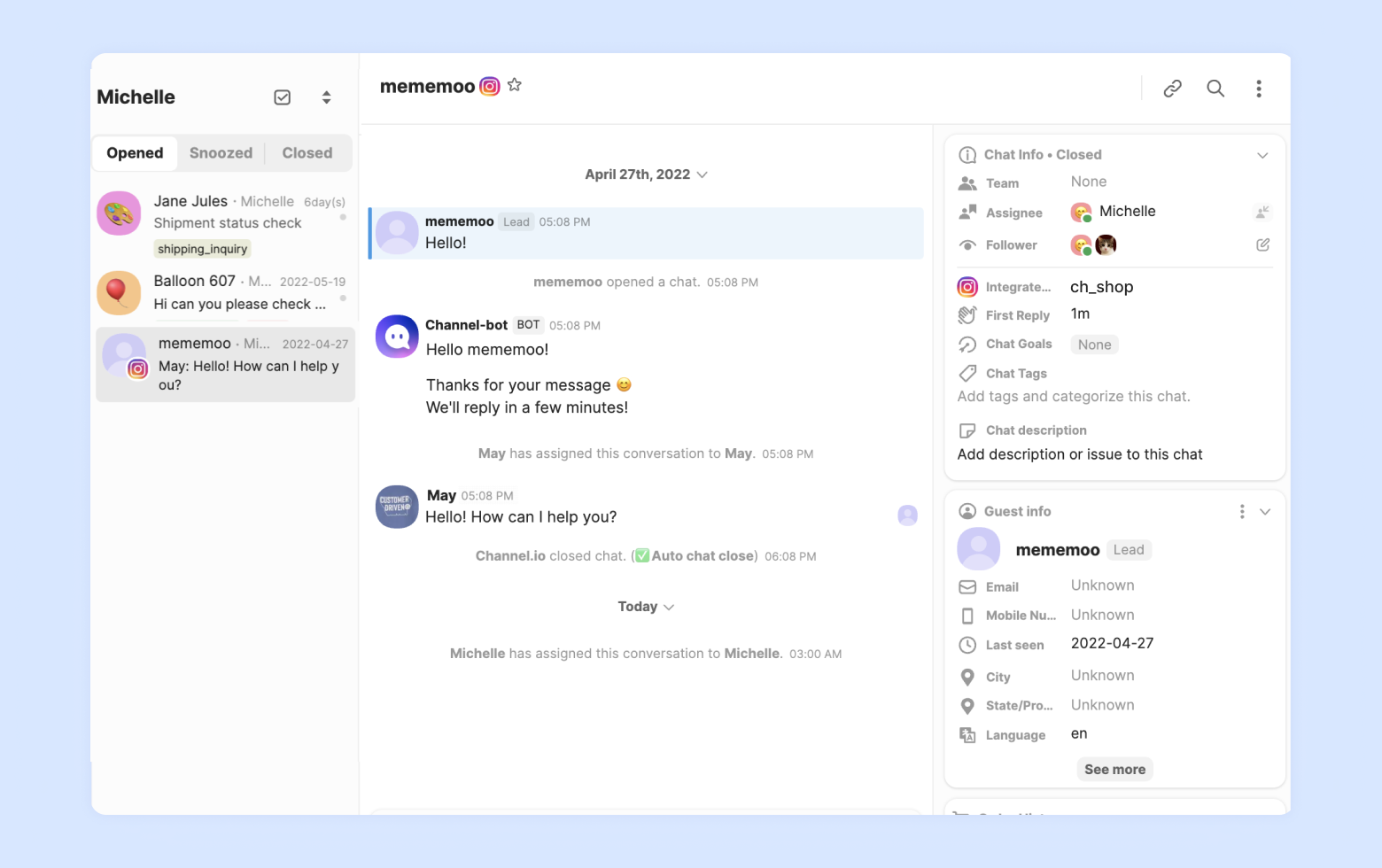 When you respond to a customer directly on Instagram Messenger, it will be displayed as a ‘bot reply’ on the Channel Talk chat window.