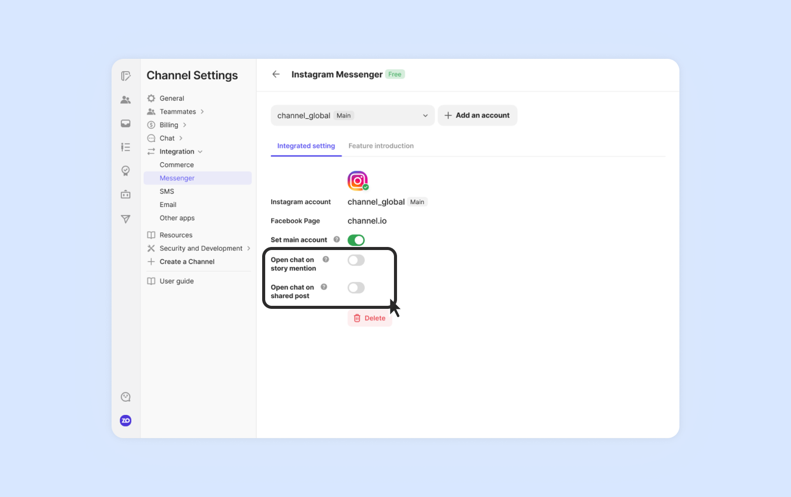 Go to [Channel Settings] - [Integration] - [Messenger] - [Instagram] - [Instagram Messenger] then click [Integrate].