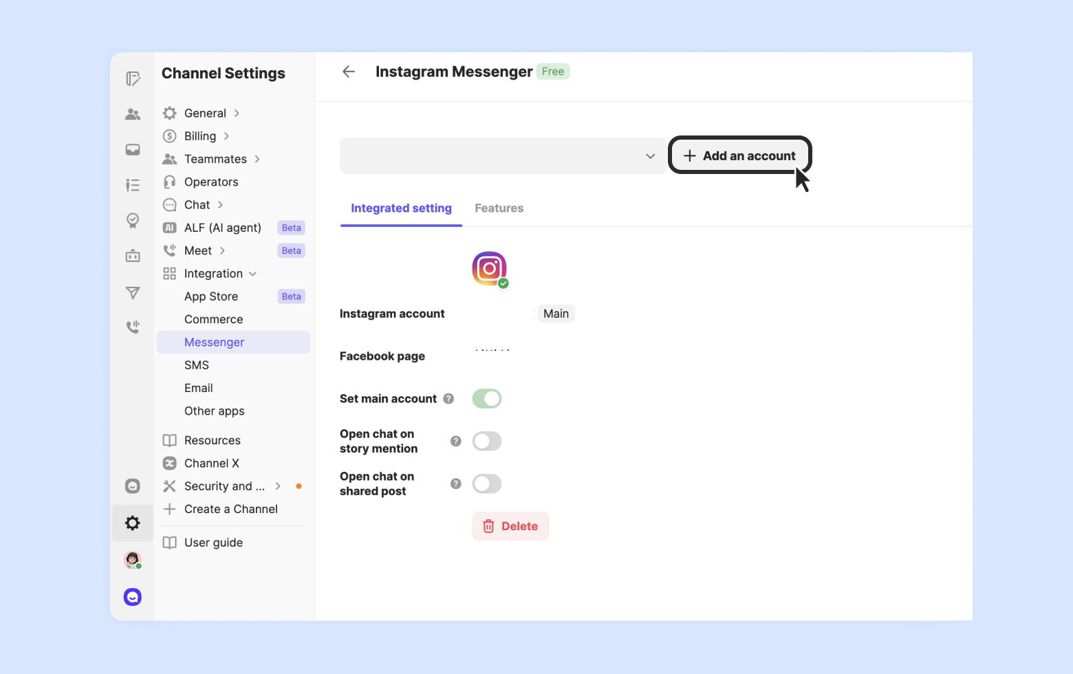 How-to: [Channel Settings] - [Integration] - [Messenger] - [Instagram] Instagram Messenger - [+ Add an account]