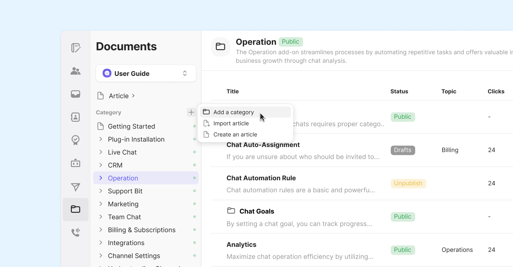You can hover over a category or article in the sidebar, or click on a category or article and select the More menu in the top right corner.