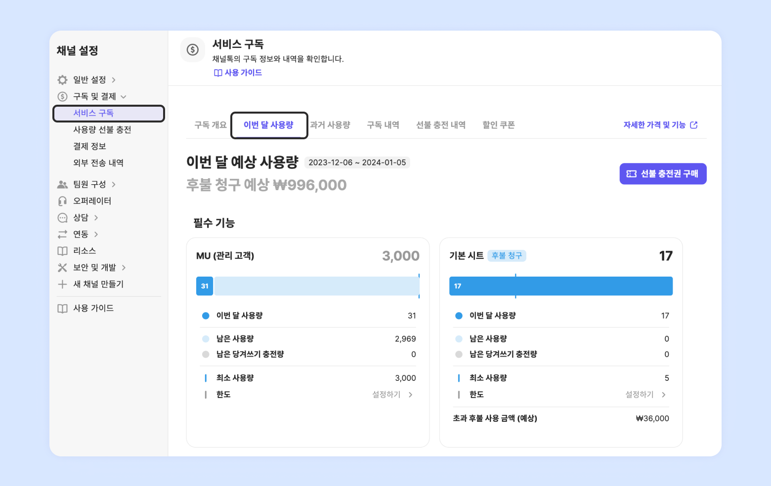 Usage or Integrations (SMS, social media[KakaoTalk message]) are not eligible for prepaid discounts and have no maximum or minimum usage limits.