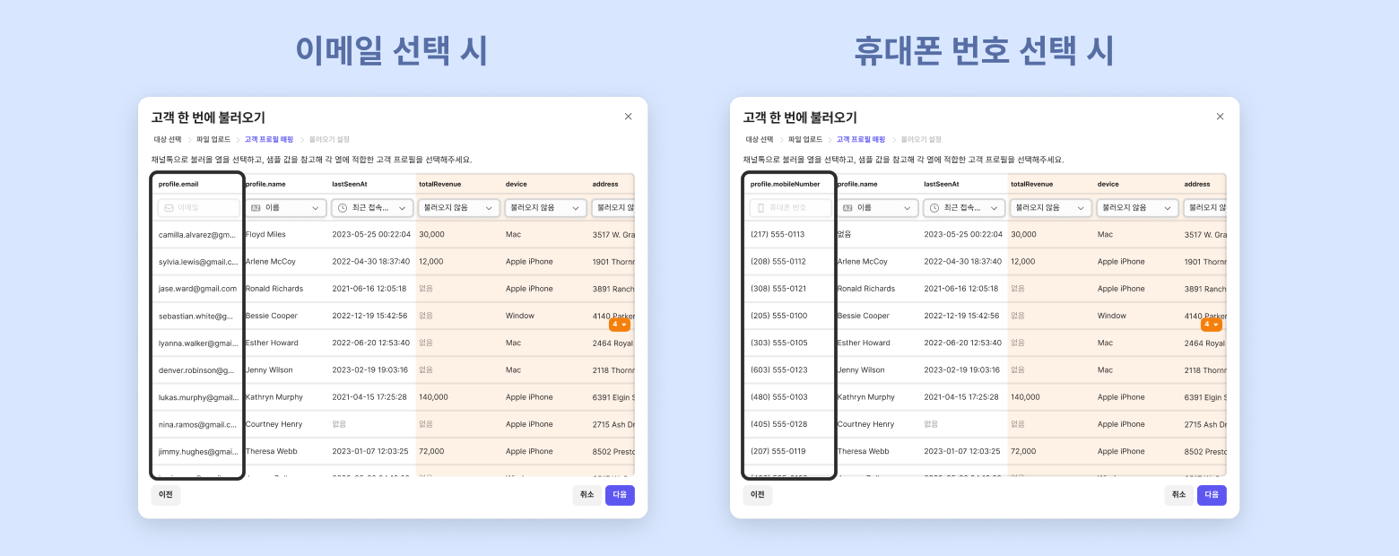 After uploading the CSV file, map the columns in your file to the ChannelTalk customer profiles.