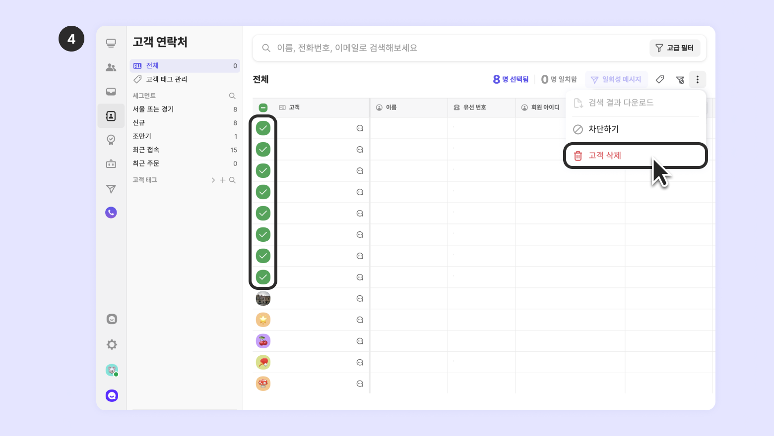 Team Members with permission to delete customers can remove them permanently. Once deleted, customer data cannot be restored. All information is erased, except for the conversation history. If the customer returns to Channel Talk later, they will be recognized as a new user.