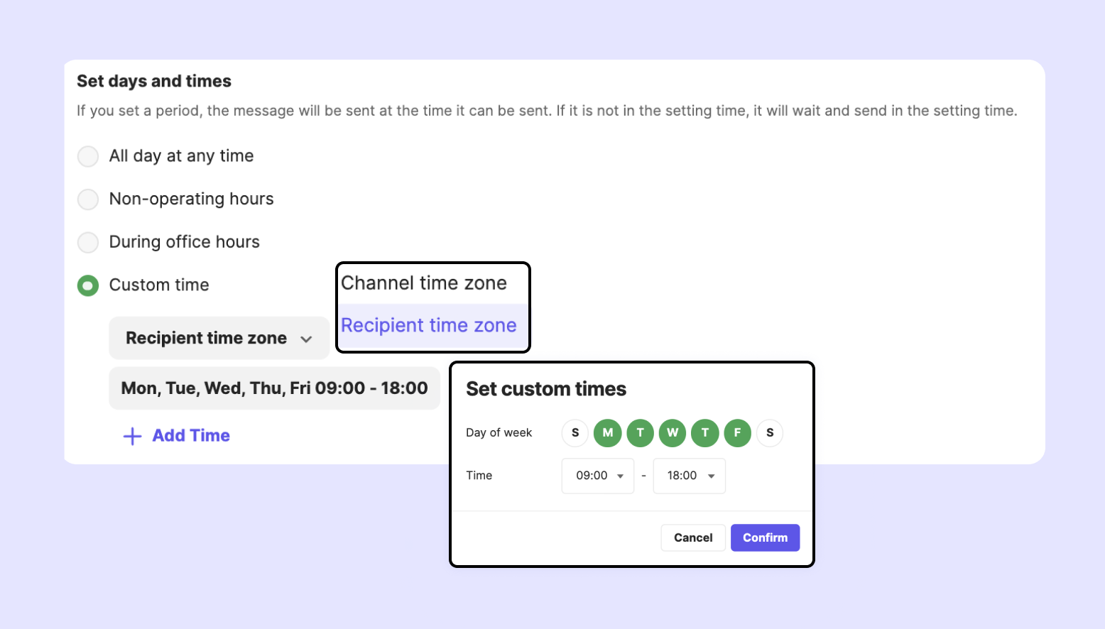 Recipient time zone: The message will be sent out based on the recipient’s time zone. If there is no recipient’s time zone information, the message will be sent out based on the channel time zone. If the recipient's time has passed the scheduled delivery time, the message won’t be delivered.