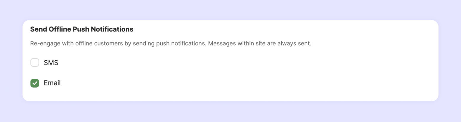 Text and email notifications will be sent if the customer is offline at the time of sending marketing campaign messages. Turning off this feature will limit notifications via the Channel Talk plug-in only.