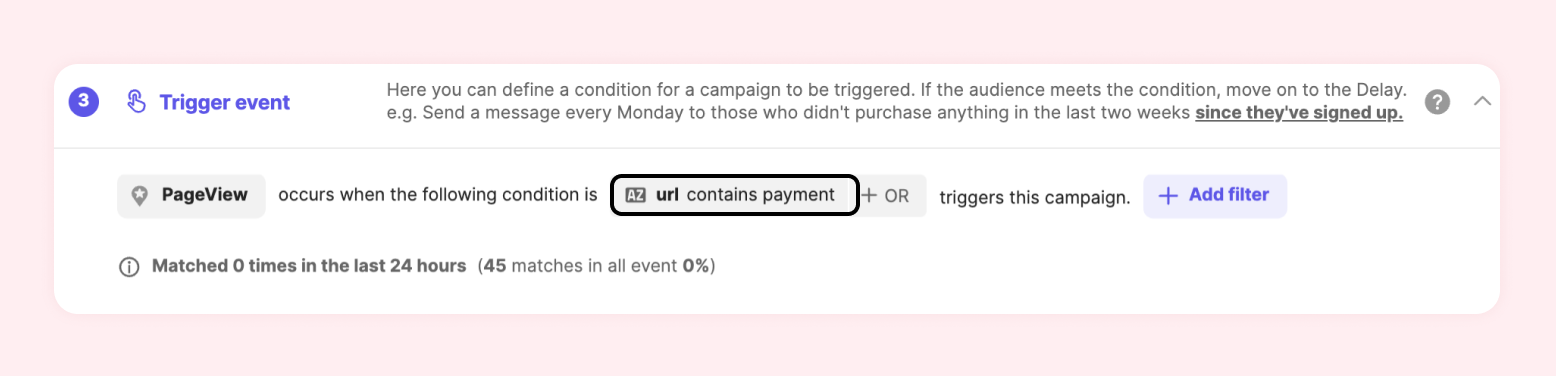 For example, if you want to display the message only on the channel.io/payment page, you should set the event as follows: pageView + URL + contains "payment".