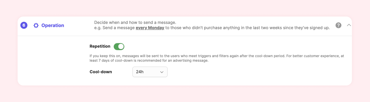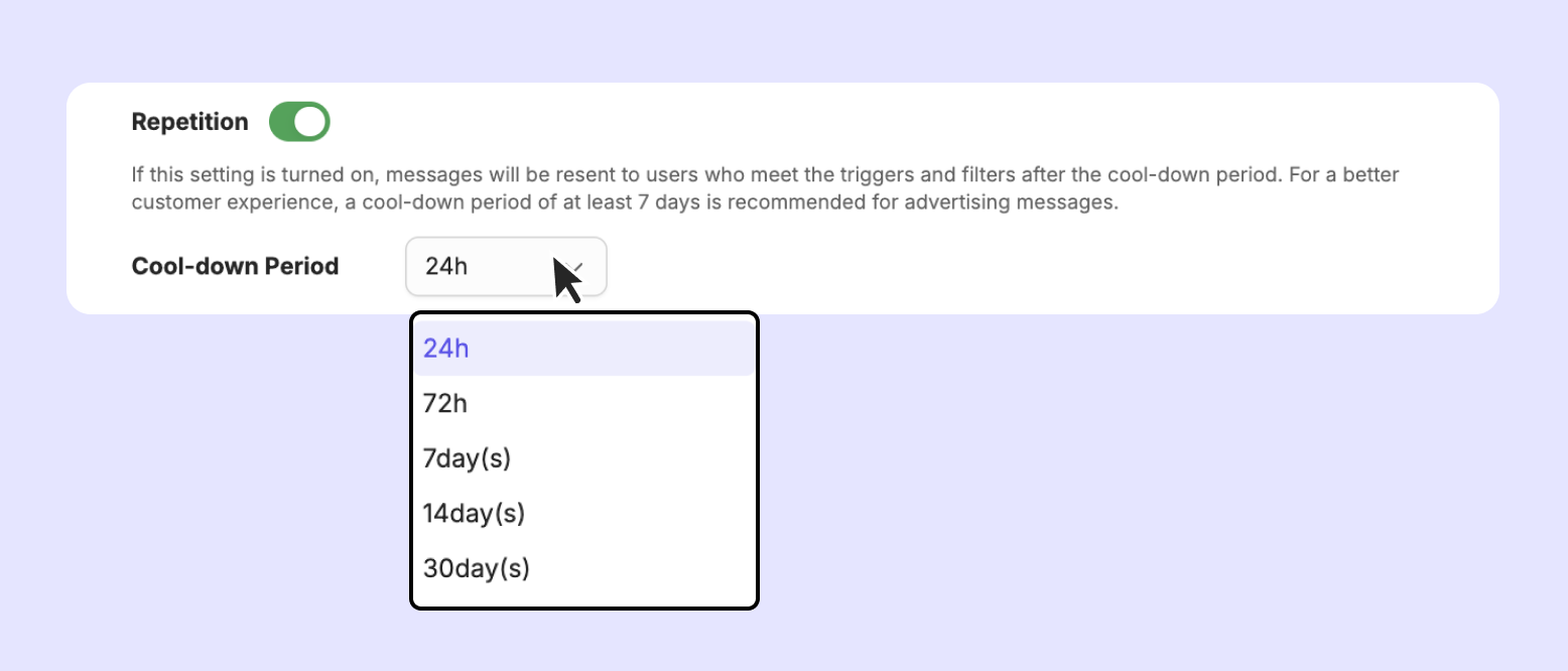 When the repetition is on, your customers can get the same message again.