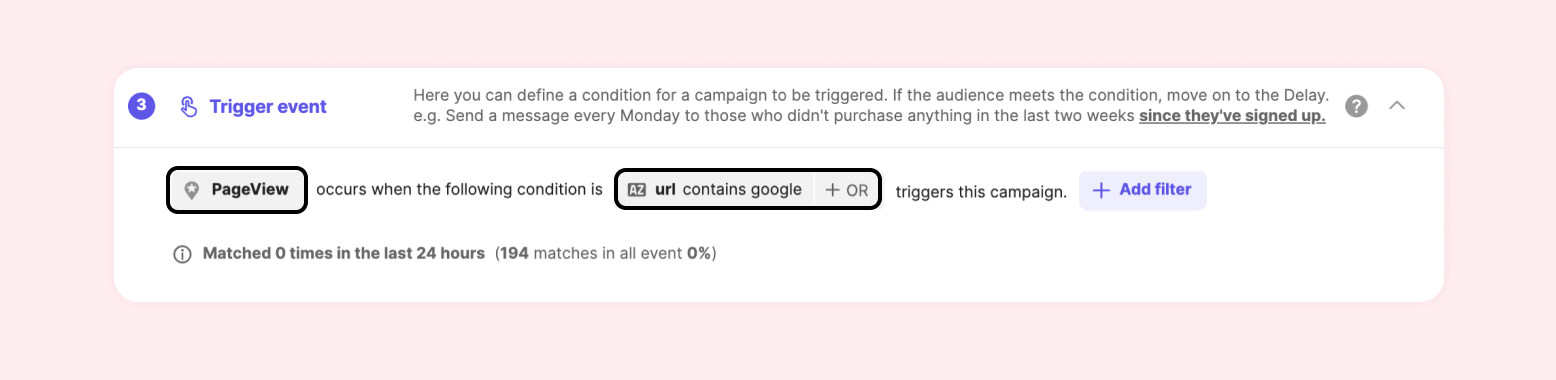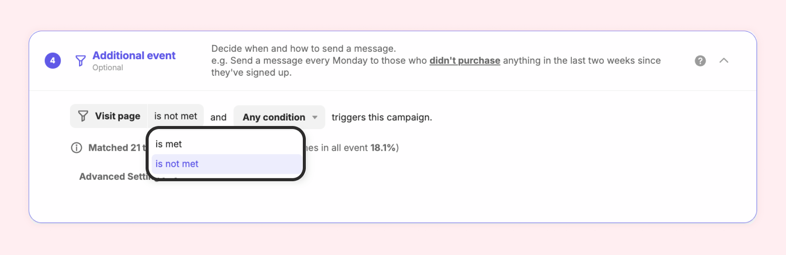 By using the additional event filter, you can send a message if there is no purchase within 1 day after placing an order, or send a message if a purchase is made within 3 days of viewing page A.