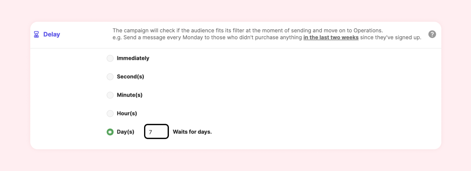 E.g.) Send a message every Monday at 9 am if the customer hasn’t purchased anything for 2 weeks after signing up.