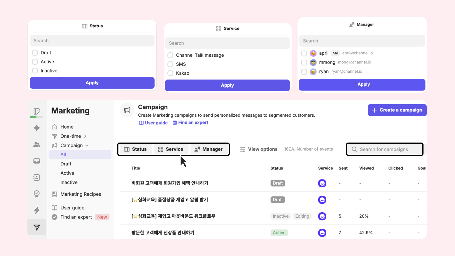 You can filter by marketing campaign status (Draft / Running / Ended), Service (Channeltalk Message / SMS / KaKao Alimtalk), and team member.