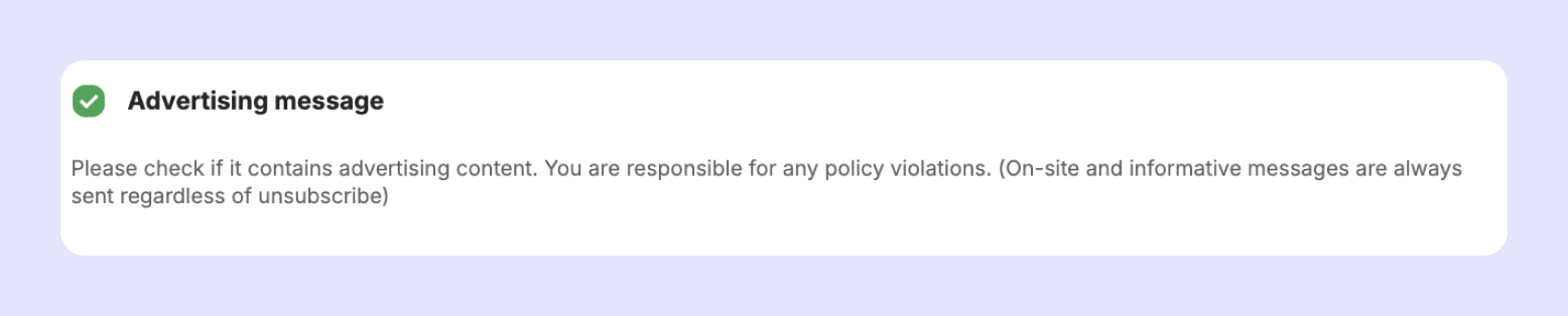 Please be sure to check this box if the message contains promotional content. 'Channel Talk Messages' that pop up when accessing the site, and informational messages, are always sent regardless of the user's opt-out status.