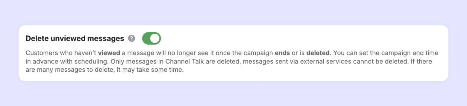 This means that when a campaign comes to an end (either at its scheduled end date or through manual intervention), any messages that the recipient has not yet read will be automatically deleted.