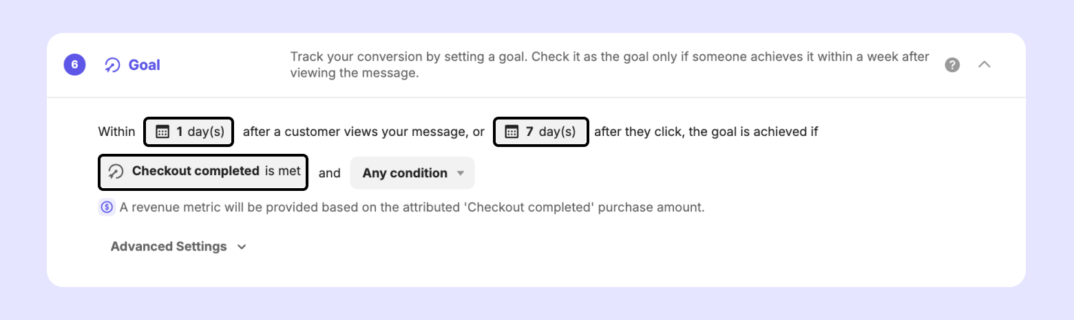 Set goals to measure the conversion rate of the message you send. When a customer who receives the message visits the website and completes the event you set, it is measured as a goal achieved. (→ Learn more)