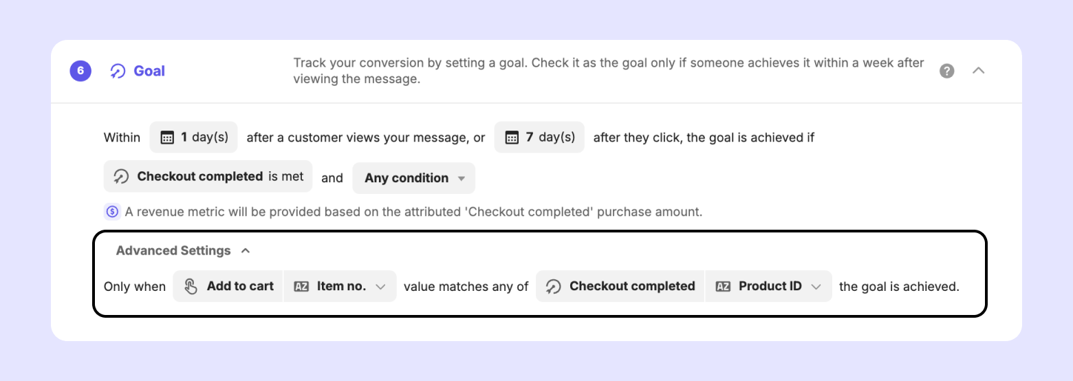 Example) You can set the goal to be achieved only when the customer purchases the identical product that they previously added to the cart.
