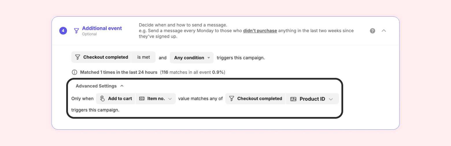 Example) If you set the Additional Event filter to "Checkout completed," you can configure the condition to be satisfied only when the customer completes the payment for the exact same product that they previously added to the cart.