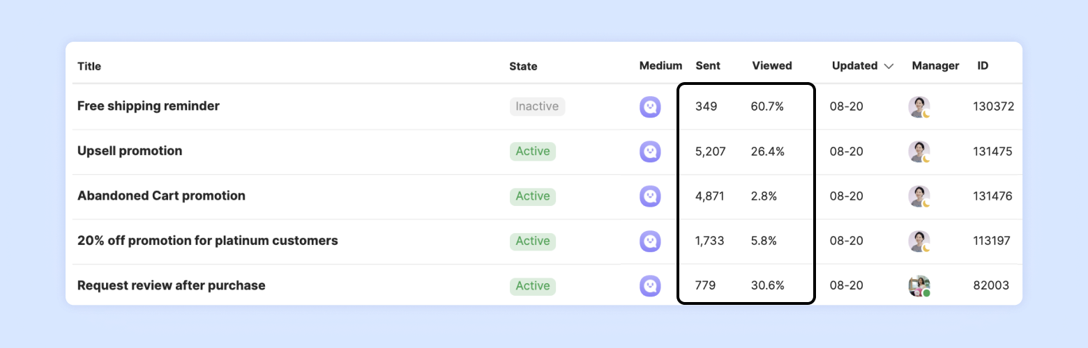You can get a breakdown of each type of marketing method through [Marketing] - [One-time Message]/[Campaigns].