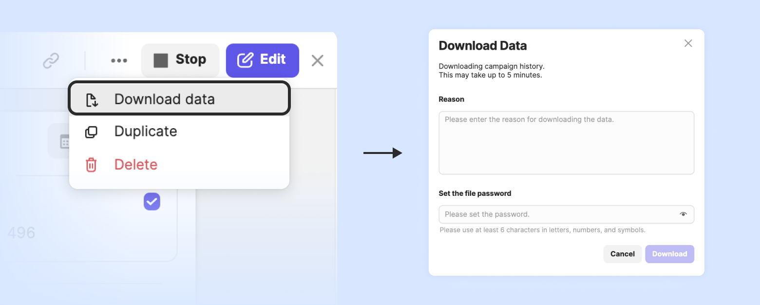 When downloading the data, a data password must be set. This is a feature that protects sensitive company data and statistics from being lost. If you lose the password you must download the data again.