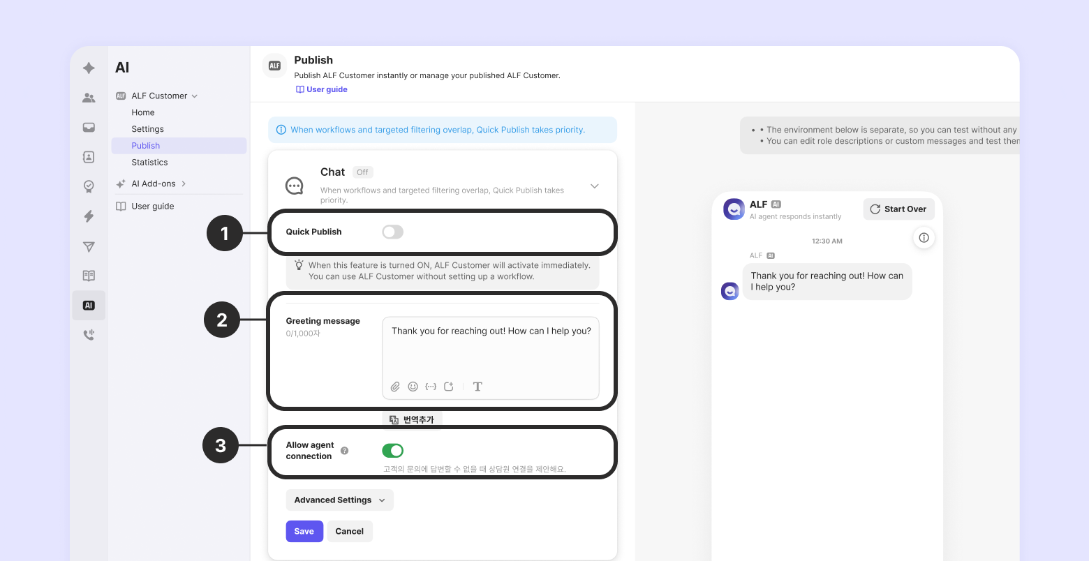 Go to [AI > ALF Customer > Publish > Quick Publish] to toggle this feature.