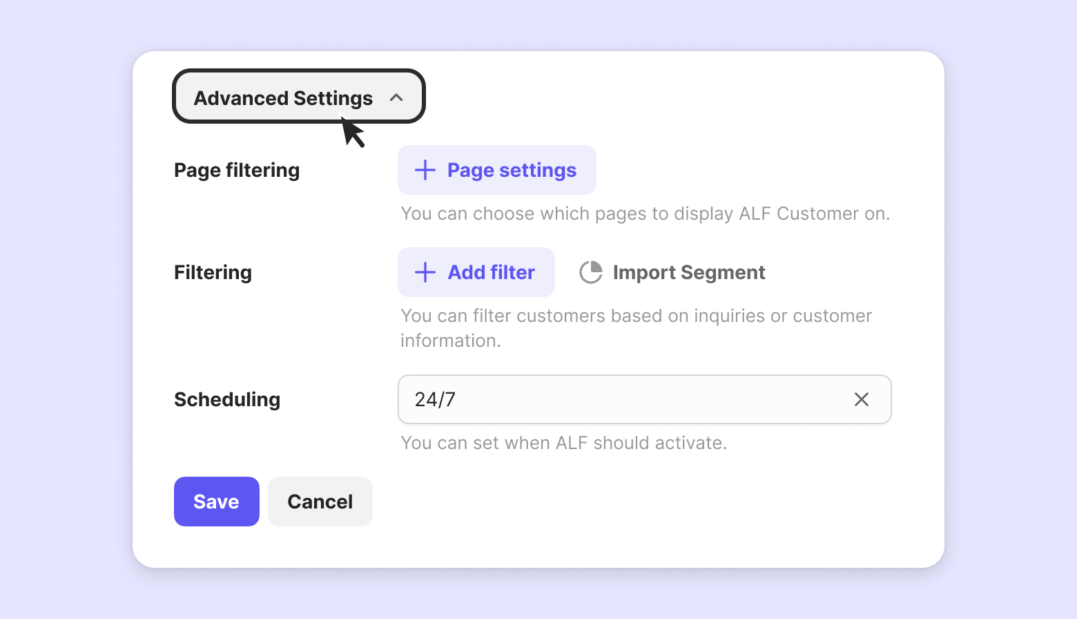 Visitors can start chatting with ALF as soon as they click the chat button—no need to configure any workflow scenarios.