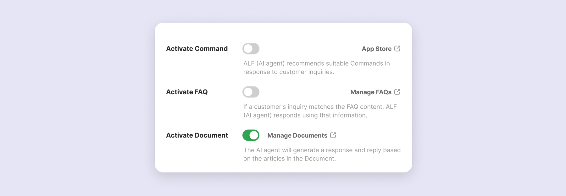 Go to [Channel Settings] - [AI Agent] and turn on 'Answers from Documents.'