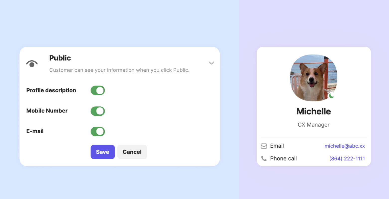 You have the option to choose whether or not to make your profile description, mobile phone number, and email visible to the public. If you choose to display all of this information publicly, your team member profile will appear as shown in the image below when viewed by a customer.
