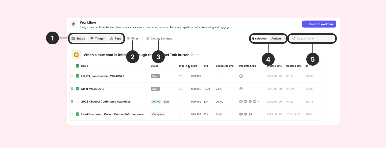 Filtering settings by triggers are displayed below the workflow name, allowing you to check the filter settings directly from the list. (→ Learn more about Triggers)