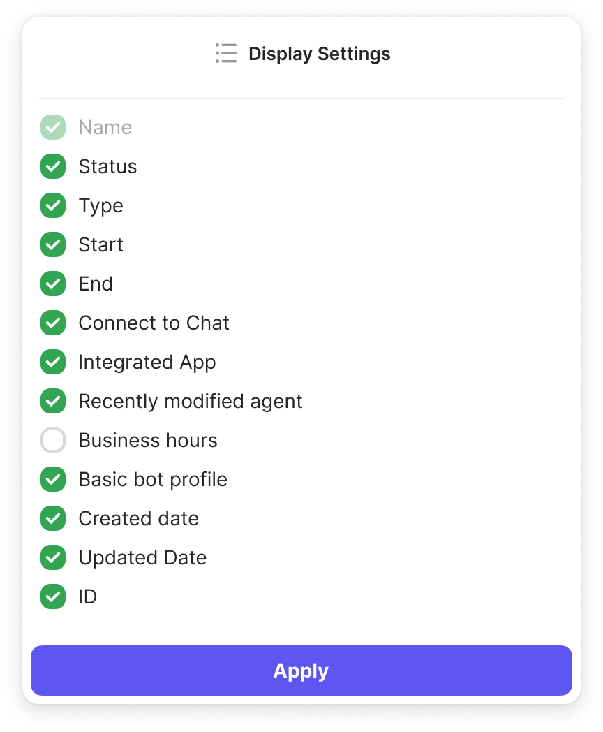 By clicking on the view settings, you can select the information you want to see in the list. Only the checked items will be displayed.