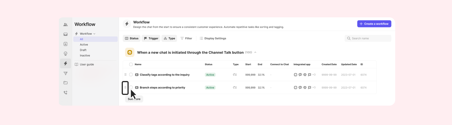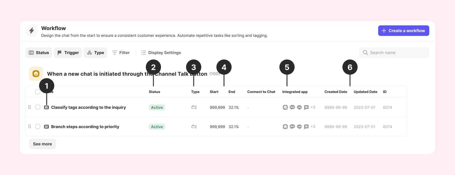 You can see workflows organized by triggers, along with their names, statuses, and other characteristics at a glance.