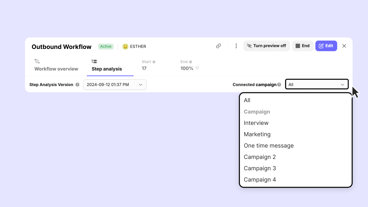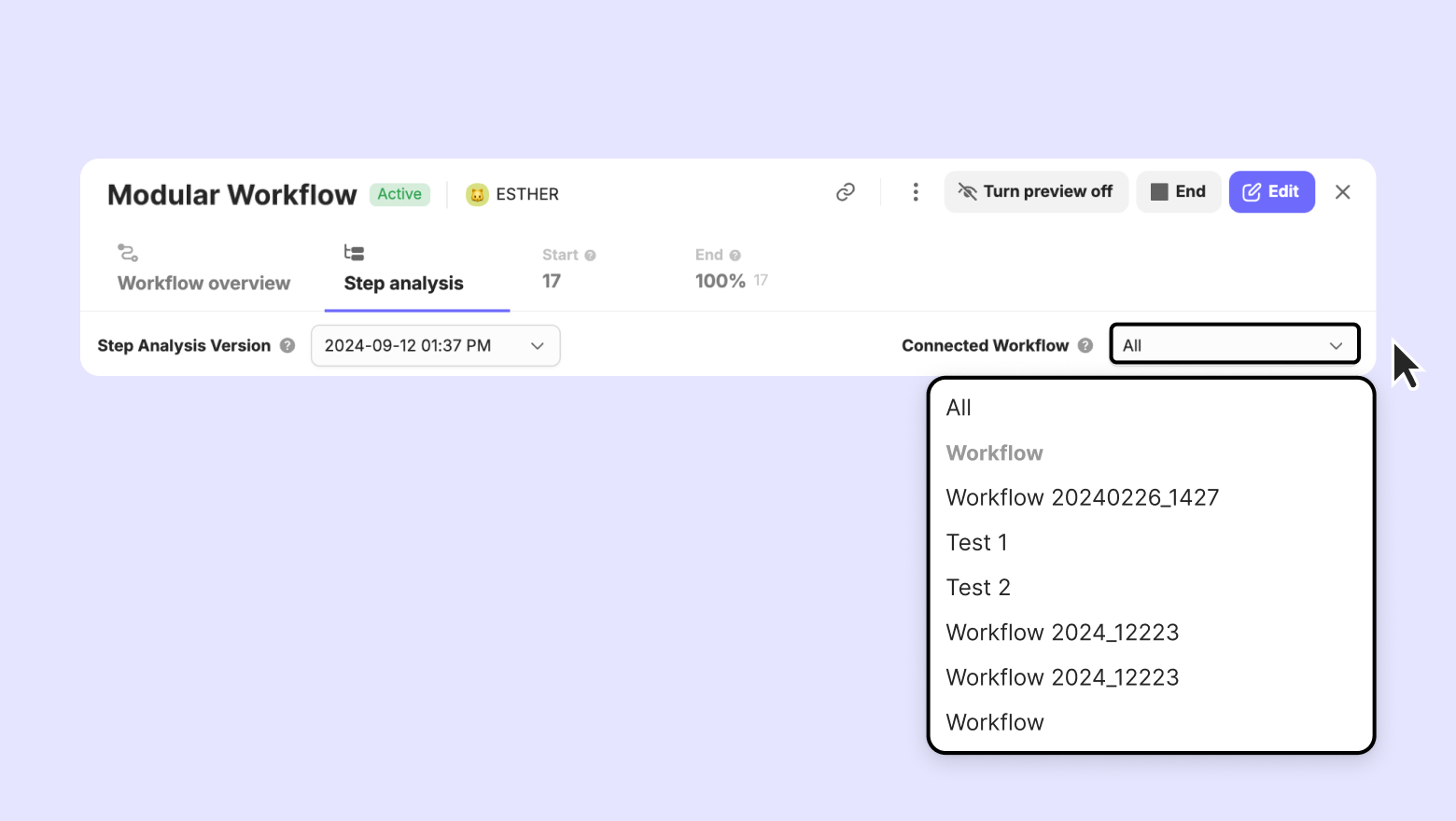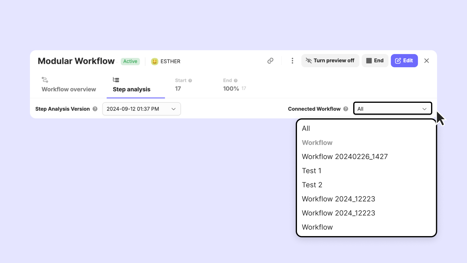 For modular workflow, you can view the step analysis according to the connected workflows. Select the workflow you want to view from 'Connected Workflows' on the right.
