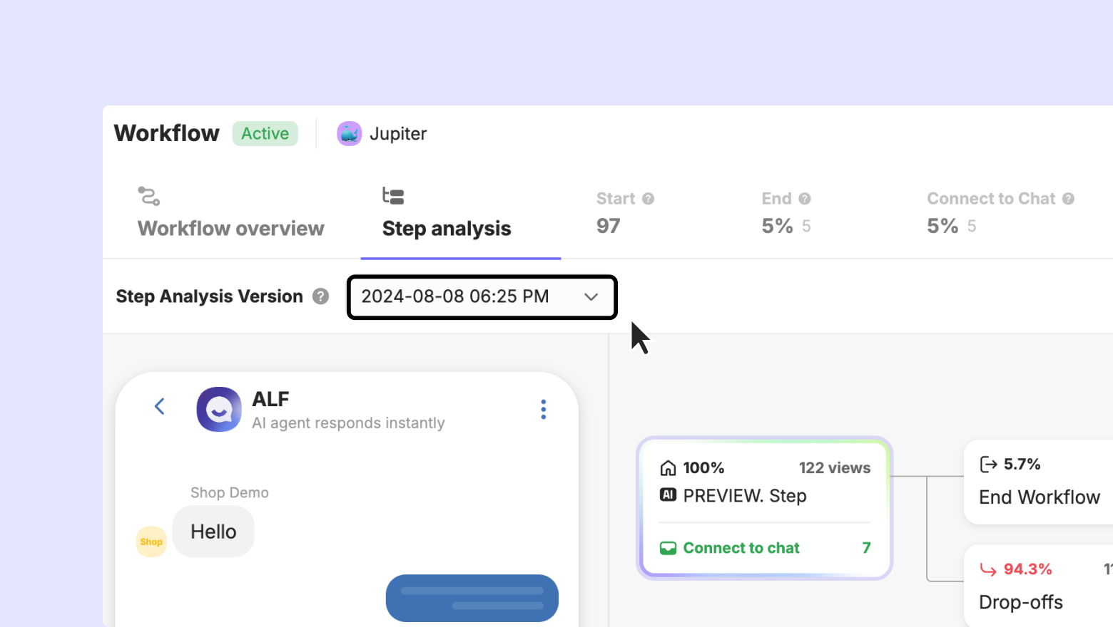 Once a workflow is published, it is managed as a new version. You can select the desired version from 'Step Analysis Version' to view the analysis for that version.