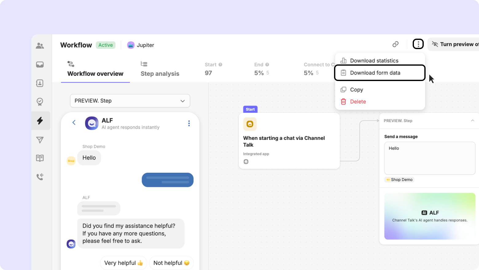 Connect to Chat: The number of times the workflow was triggered by 'Starting a chat via Channel Talk'.