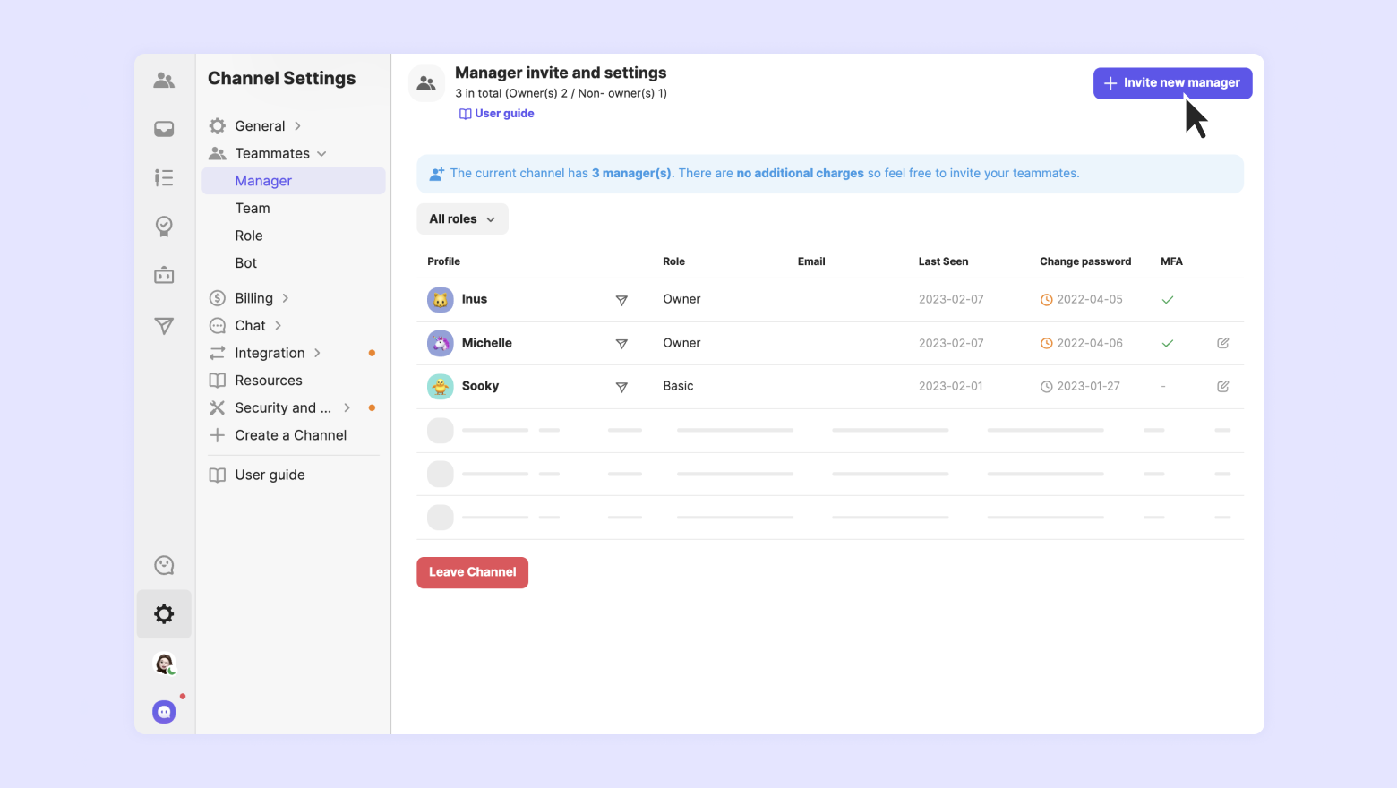 An Owner can directly invite a new member to the channel by the [Invite New Team Member] button. You can invite your team members in three separate ways: