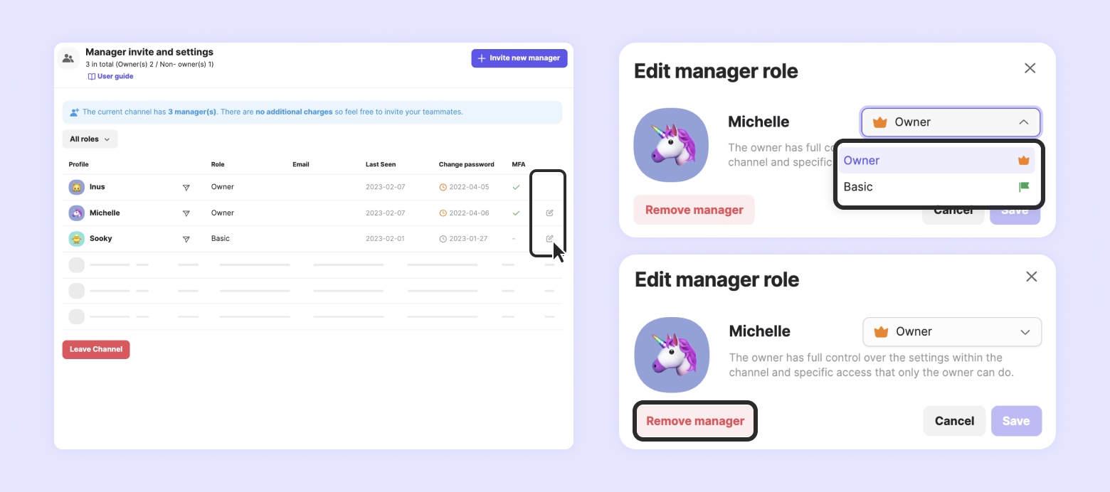 Through the share link, you can directly invite members to your channel, and check the list of members at any time! You can also edit the permissions of each team member.