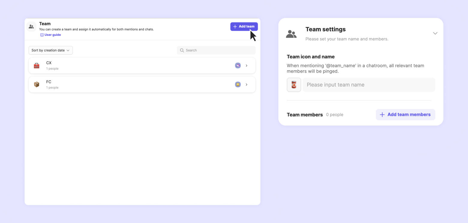Now that you have invited all your team members onto your channel, it's time to now set them into their teams! Marketing, Sales, Design, any team you need you can make and add new team members! The team function is useful for both team chat and user chats to get the perfect conversations going.