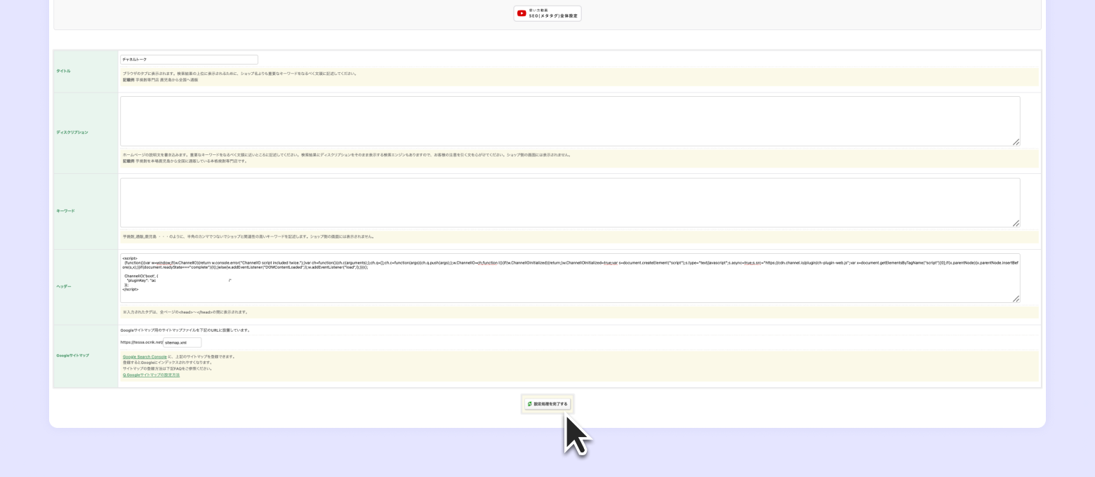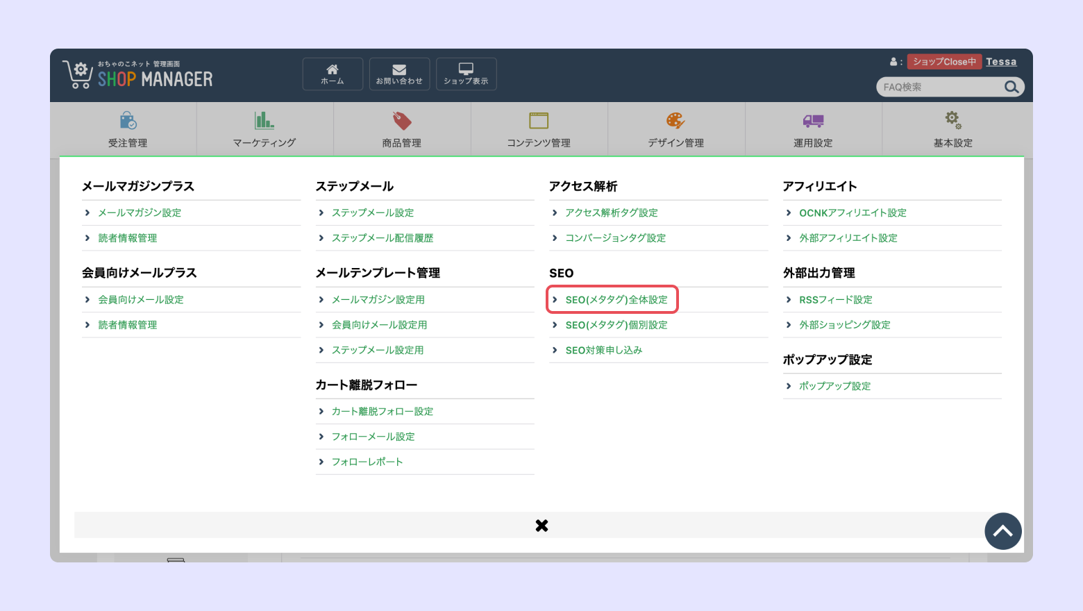 [マーケティング] - [SEO(メタタグ)全体設定] を選択します。