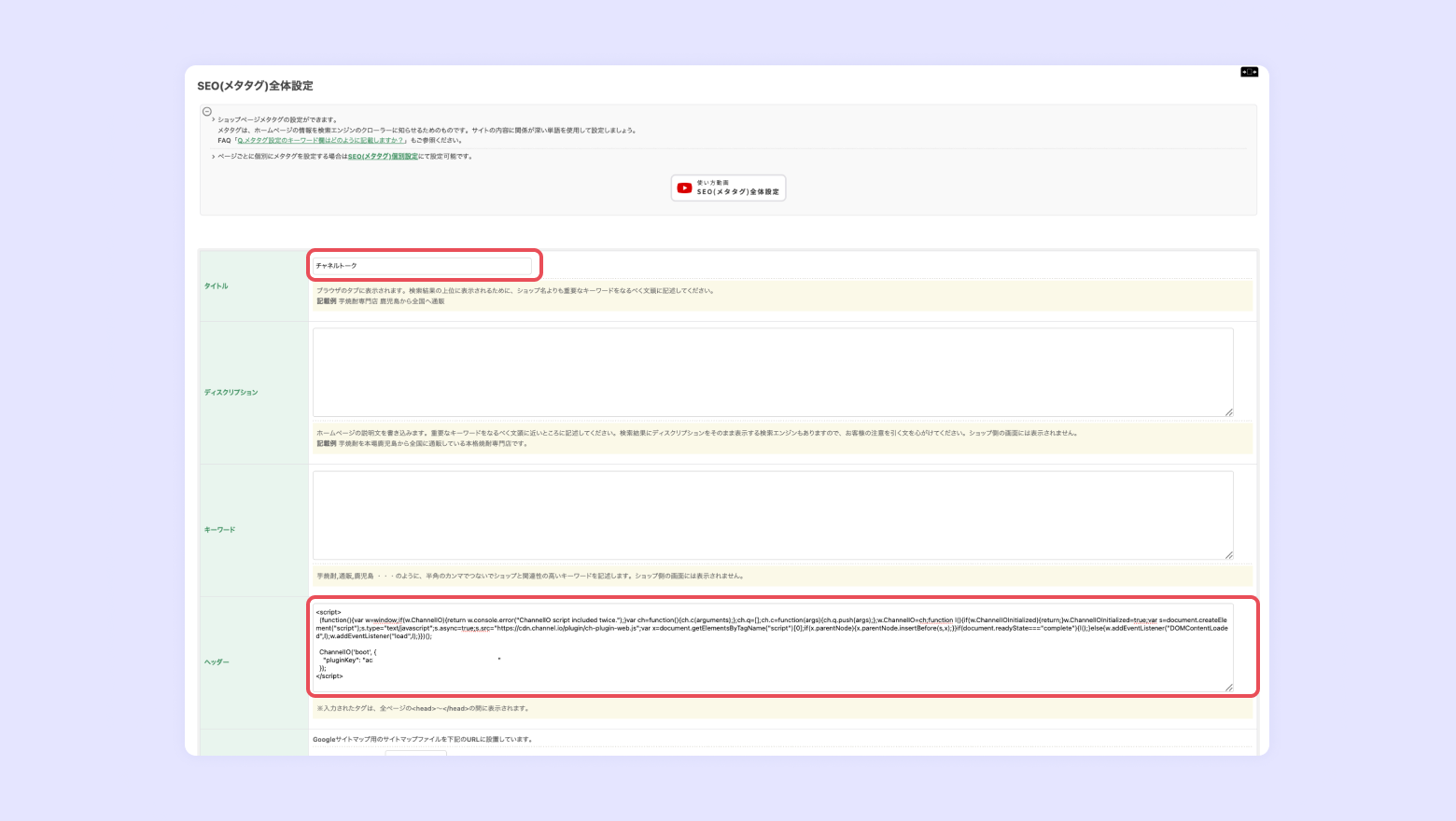 [タイトル] に"チャネルトーク"などを入力し、[ヘッダー] に先ほどコピーした基本コードを貼り付けます。
