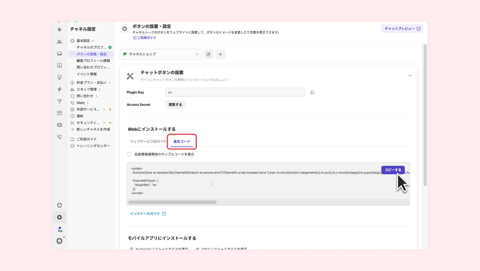 [チャネル設定] - [基本設定] - [ボタンの設置・設定] - [チャットボタンの設置] - [基本コード] を開き、基本コードにマウスを当てて [コピーする] をクリックし、基本コードをコピーします。
