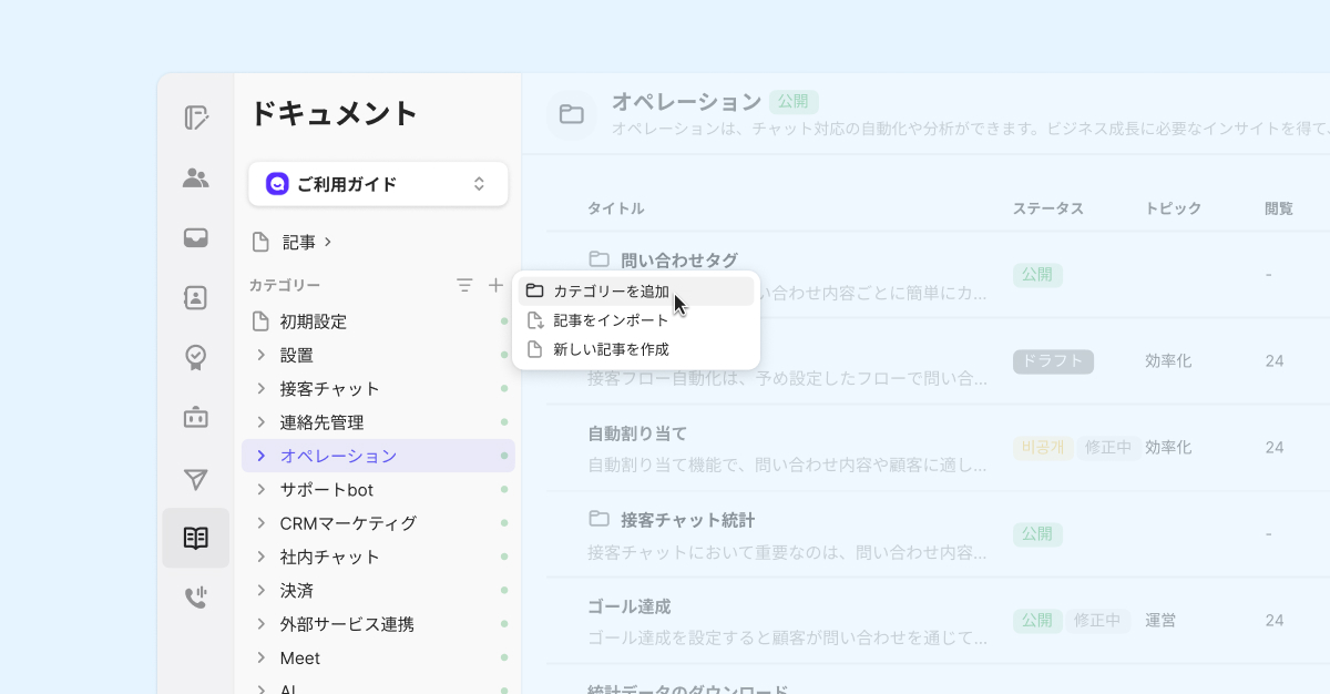方法:[ドキュメント] - [サイドバー内の"カテゴリー"の右側にある+ボタン] - [カテゴリーを追加]
