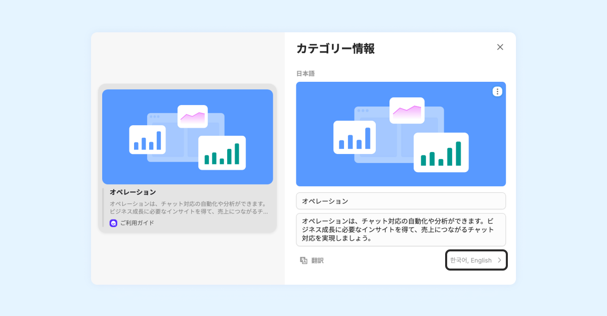 スペース設定で [言語を追加] をした場合、カテゴリー方法にも追加した言語に対する [翻訳] が必要です。もし翻訳が入力されない場合、チームメンバーが見るチャネルトーク管理画面では基本言語が表示されると同時にアラートが表示され、顧客の画面では該当カテゴリーに含まれる記事は表示されません。