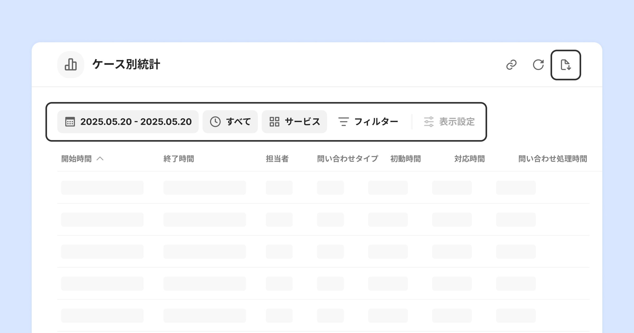 場所:[オペレーション] - [問い合わせ統計] - [ケース別] - 右上の [ダウンロード] ボタン