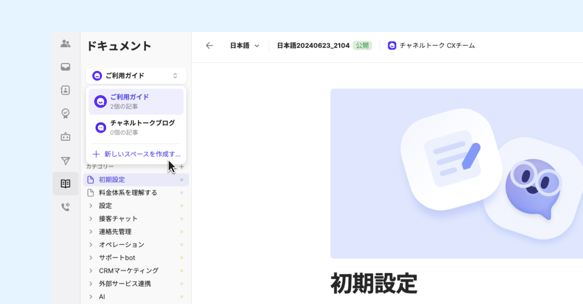 スペースがある場合:ドキュメントのサイドバー上部のスペースリストをクリックし、[新しいスペースを作成] ボタンをクリックして作成できます。