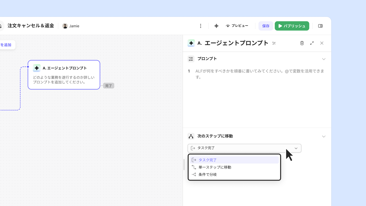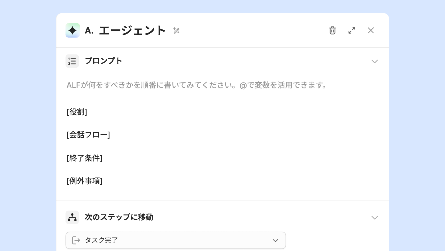 ALFがプロンプトの順番に沿って問い合わせ対応をするステップです。顧客にどのような言葉で会話するのか、どのような順序で業務を処理するかを定義することができます。実際のチームメンバーの業務処理プロセスを自然言語で作成できるため、非開発者でも簡単に設計できます。