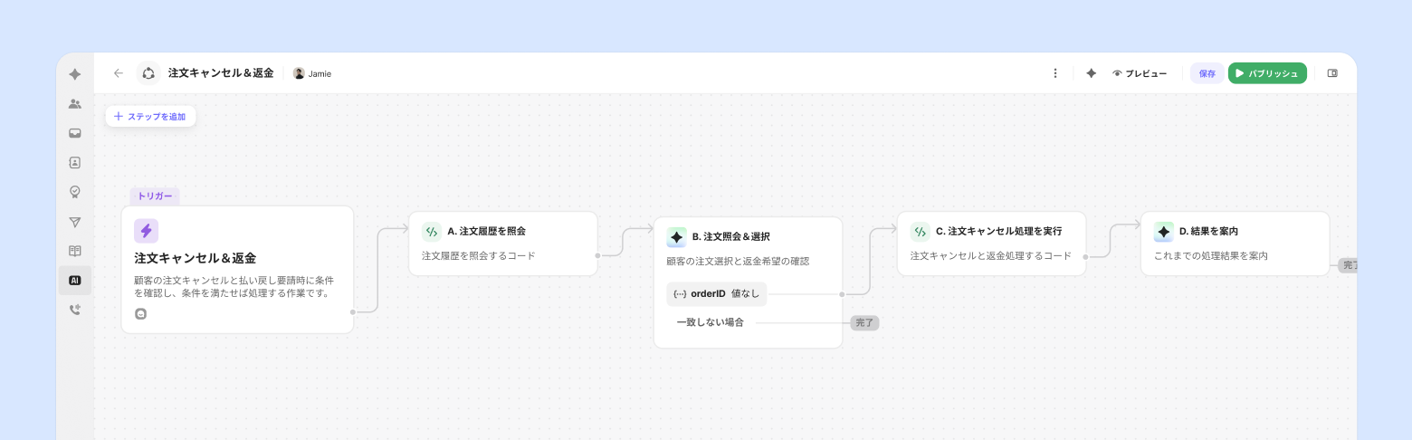 例えば、顧客が「注文をキャンセルしたいです」と言うと、単に「キャンセル可能かをこちらで確認してください」と回答するのではなく、注文履歴を照会して→キャンセル可能かを判断し→キャンセル結果をシステムに反映した後→顧客に最終結果を案内することができます。