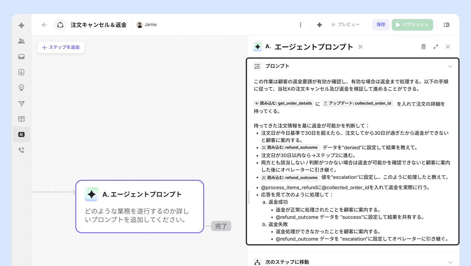 エージェントステップは、全てのプロンプトを実行後、顧客からの返信がある場合にのみ次のステップに進みます。